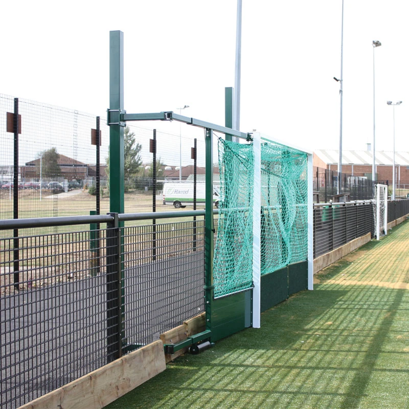 The Harrod Sport Fence Folding Hockey Goals have unique pivot joints allowing the hockey goal to fold back against a surround fence without detaching the backbars.