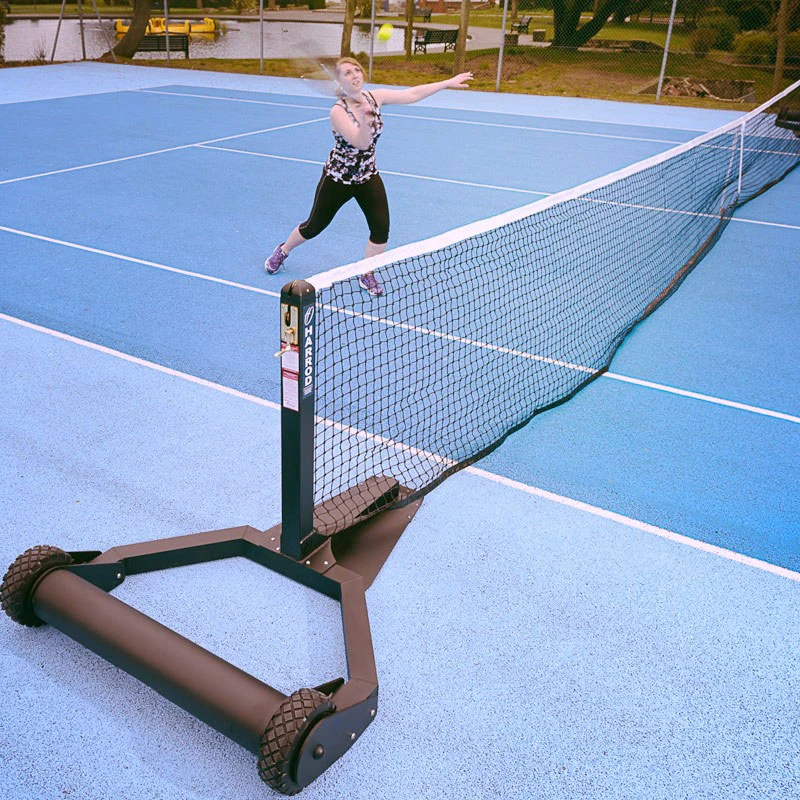 The Harrod Sport Integral Weighted Wheelaway Tennis Posts have a revolutionary tennis post design with Ski Plate, encompassing the unique Harrod Sport integral weighted roller system, as a single solution for all court surfaces.