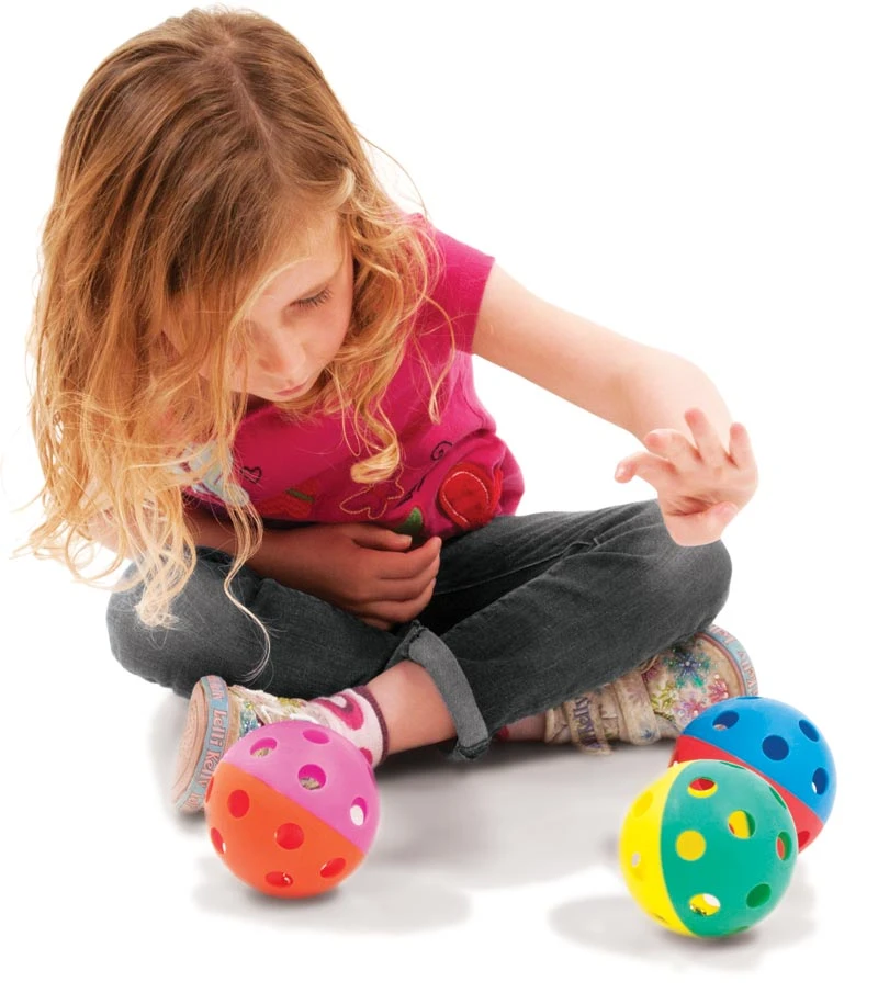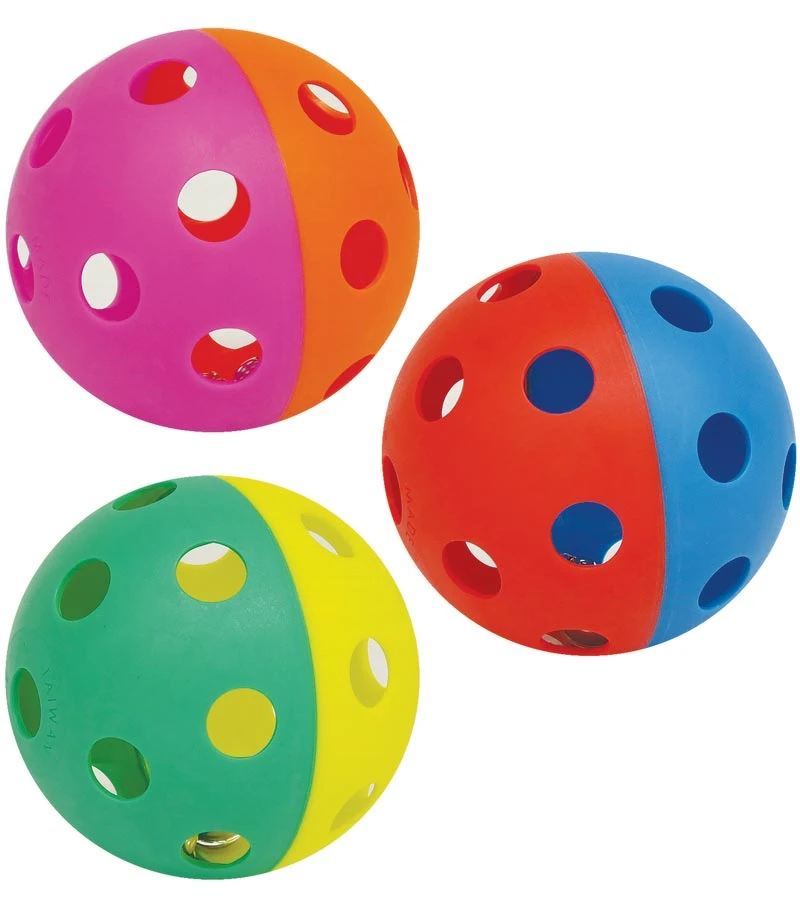 - 9cm dual coloured ball contains balls giving it an audible chime when used.