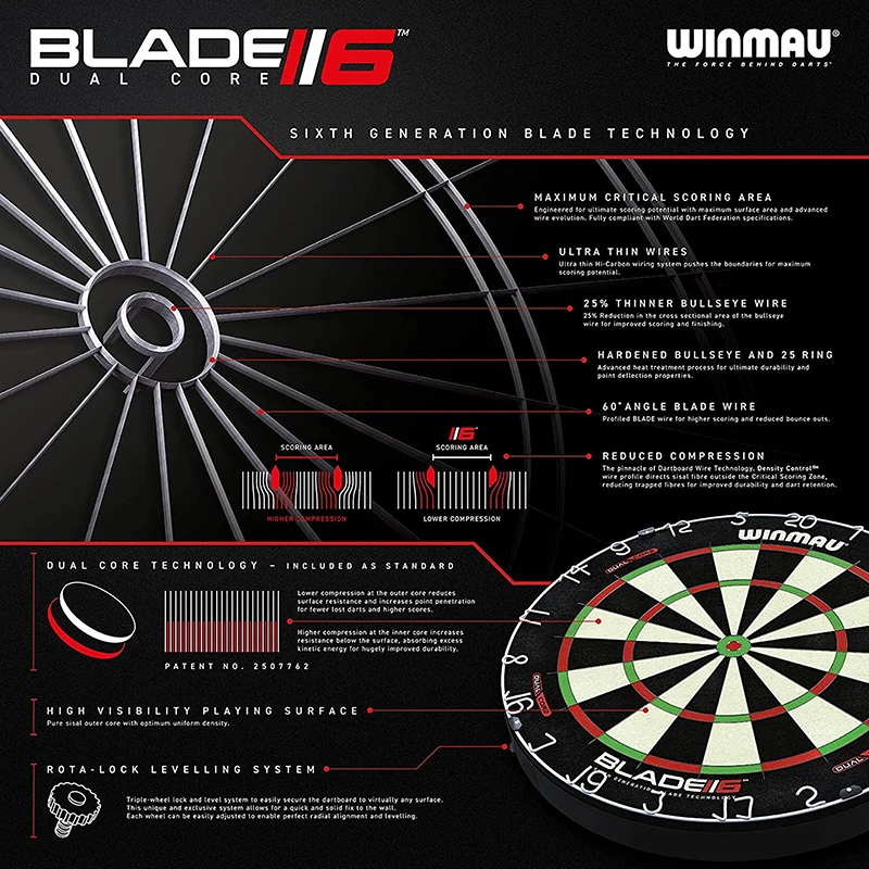 Blade’s pioneering web design features the latest ‘Density Control™’ wire for optimum fibre density and improved dart retention in the double, treble and bullseye zones, for maximum scoring power.